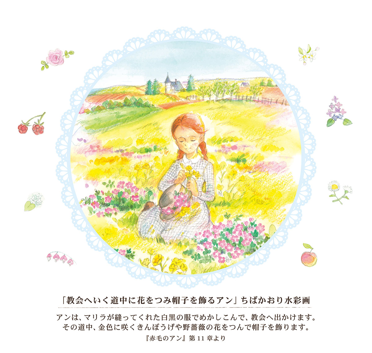 [水彩画] ちばかおり。小花の絵は、 ビジュアル特別版 『赤毛のアン』(松本侑子文、ちばかおり絵、 世界文化社)より転載