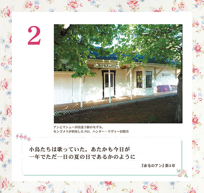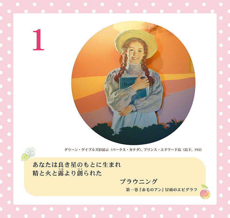 グリーン・ゲイブルズ、アンの部屋、リンゴの花咲く「歓びの白い路」、プリンス・エドワード島の赤土の道、アンが通う大学、暮らす町……。