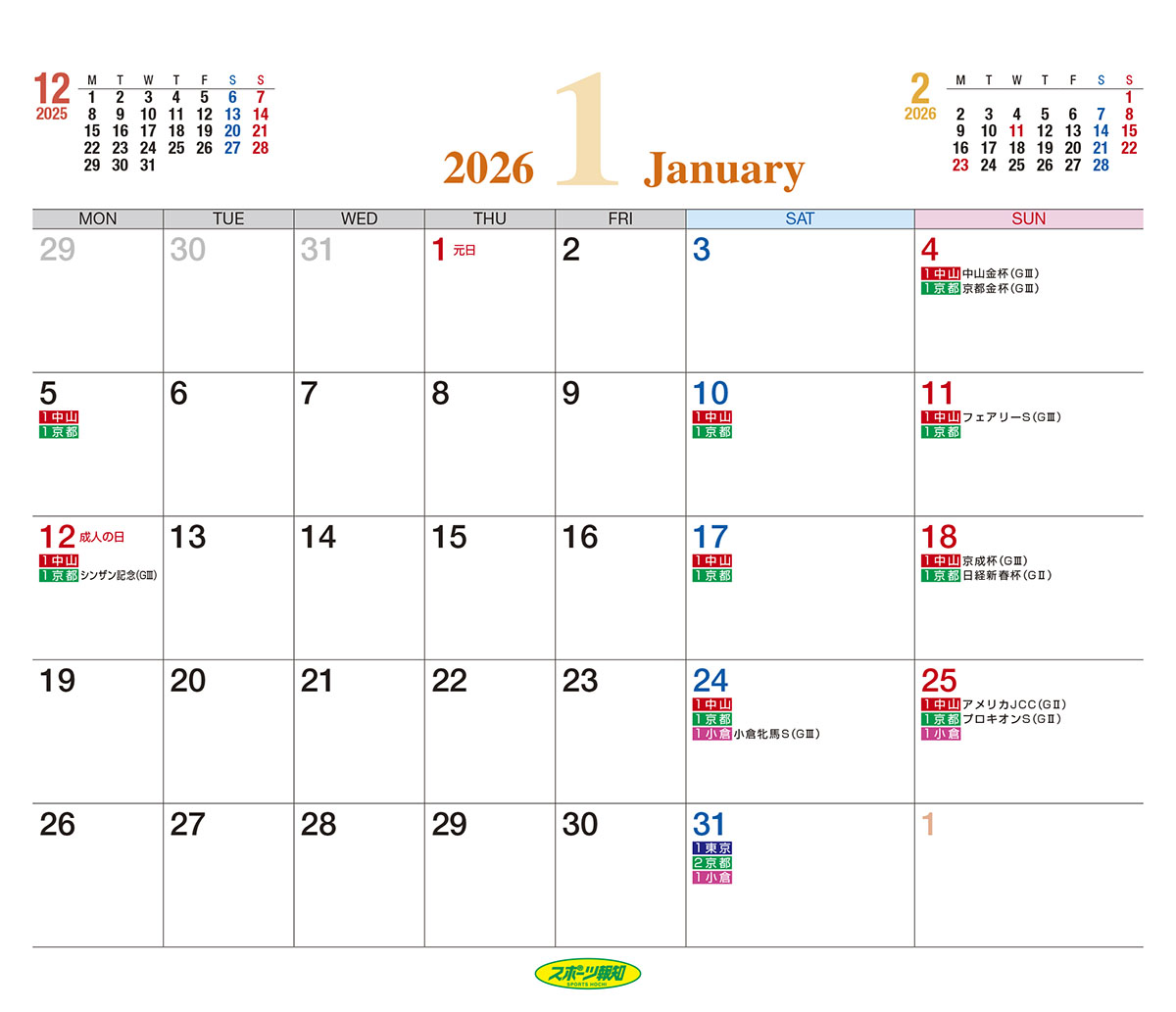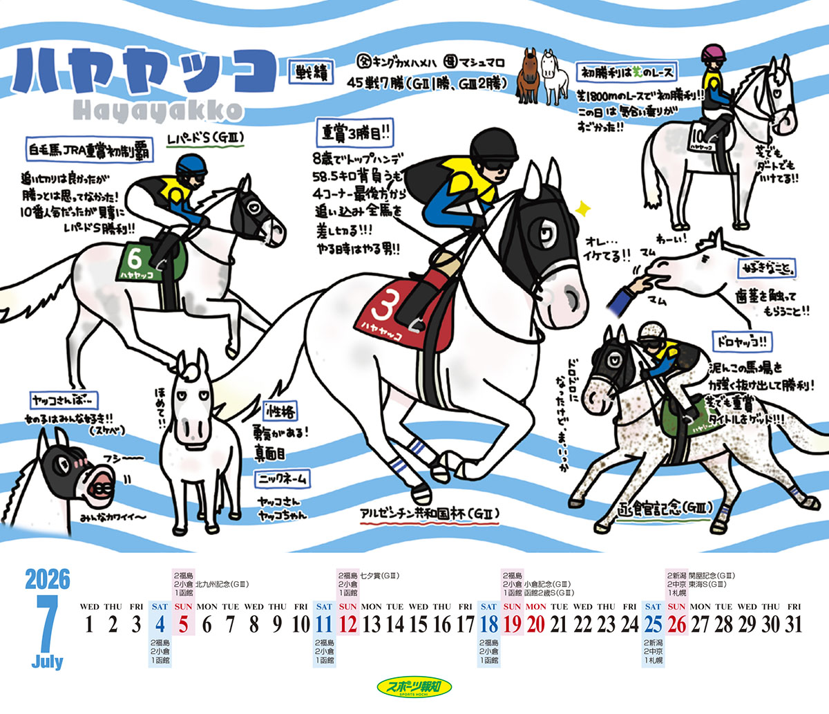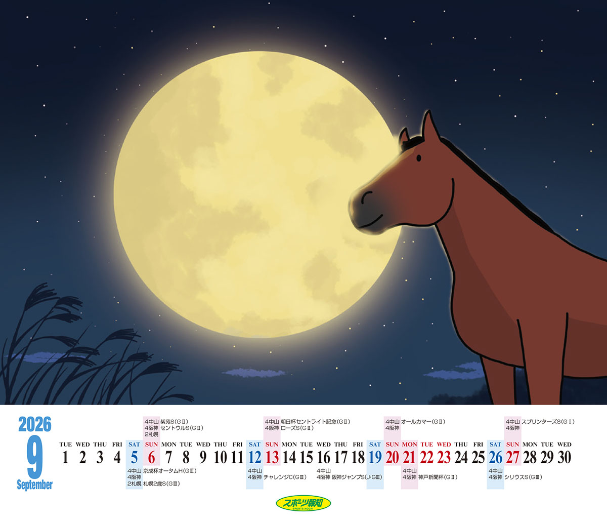 人気馬イラストレーター・おがわじゅりさんが実在馬と架空馬を愛くるしく描いています。さらに2026年JRAの開催レース日程も載っており、可愛らしさと実用性を兼ね備えています。