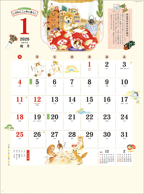 大人気絵本シリーズ「しばわんこ」のカレンダーが登場!和の暮らしの楽しみ方、知っておくと役立つ作法や日本の風習に関する知識を「しばわんこ」と「みけにゃんこ」が四季折々のイラストとともに楽しくわかりやすく伝えてくれます。