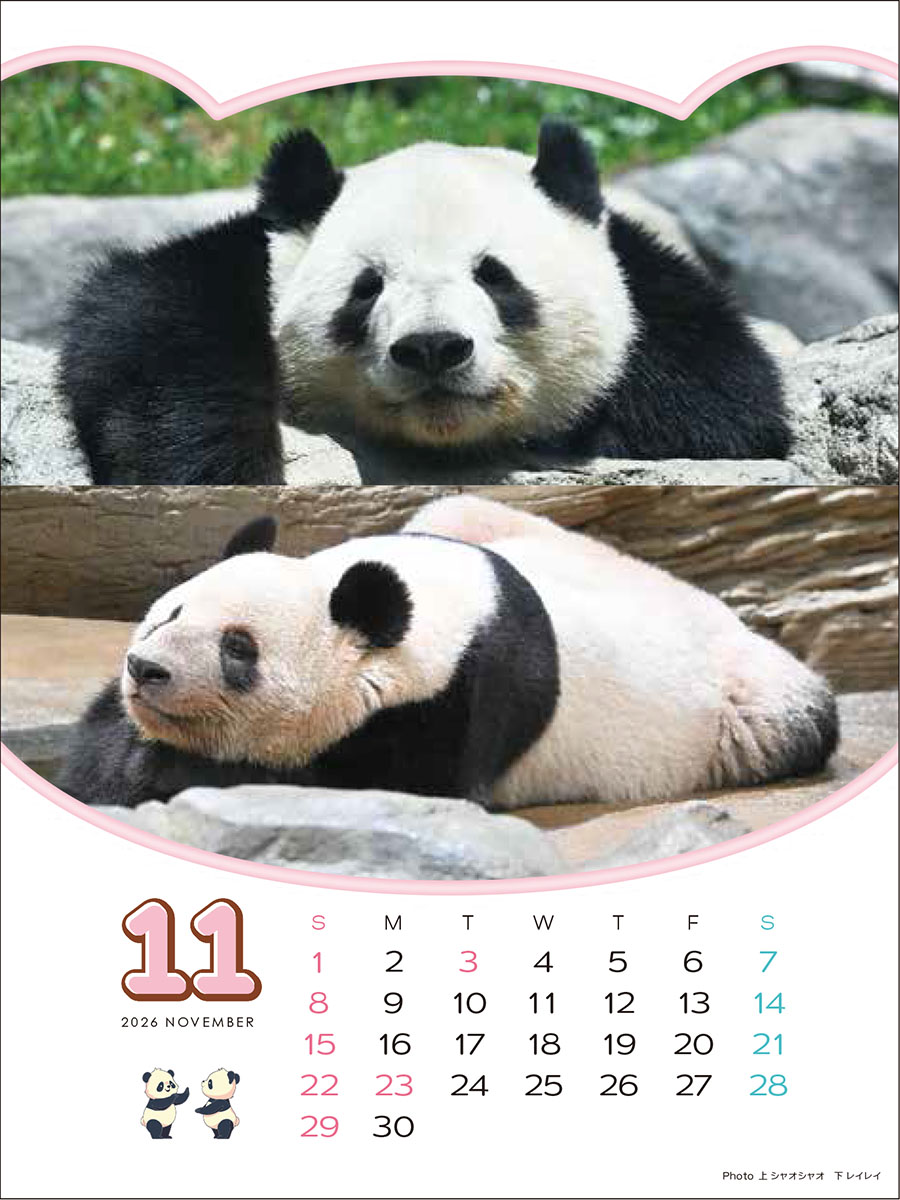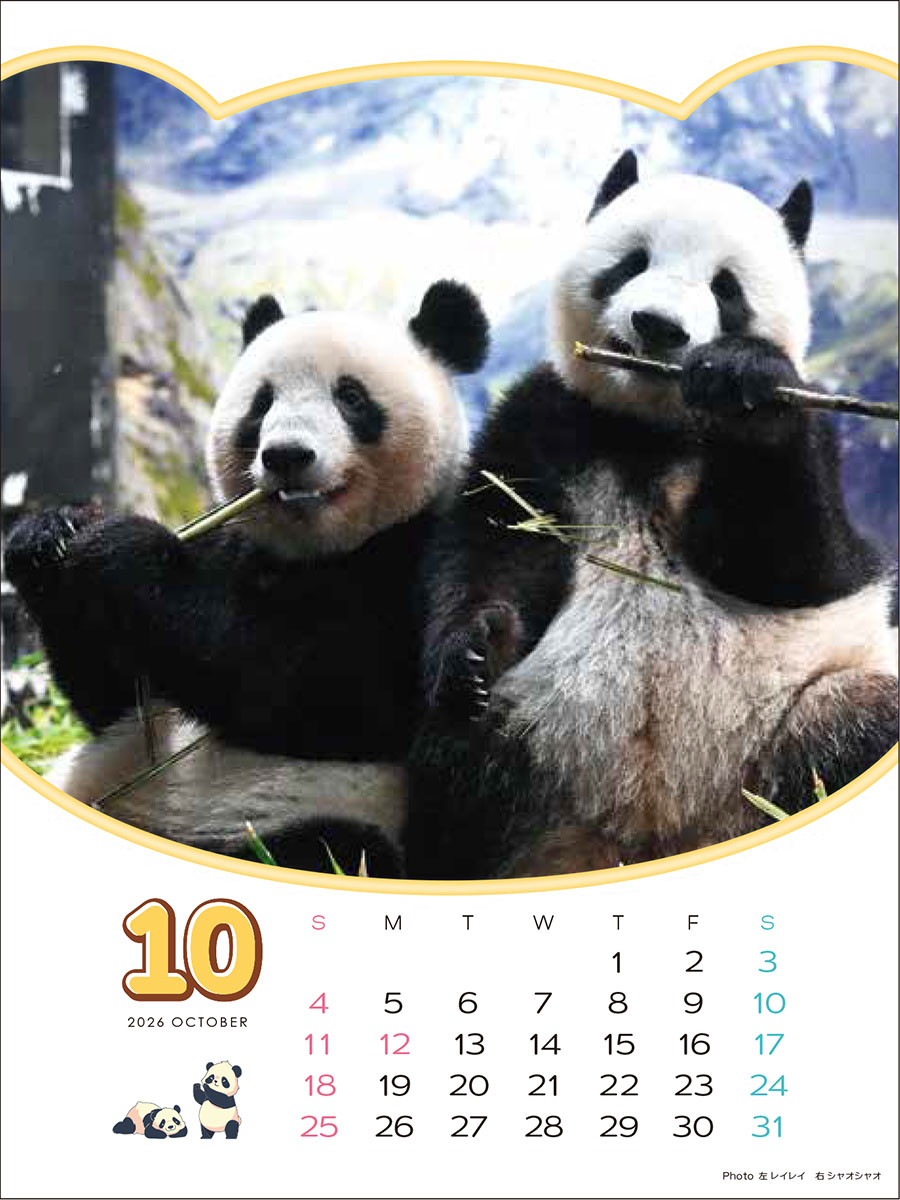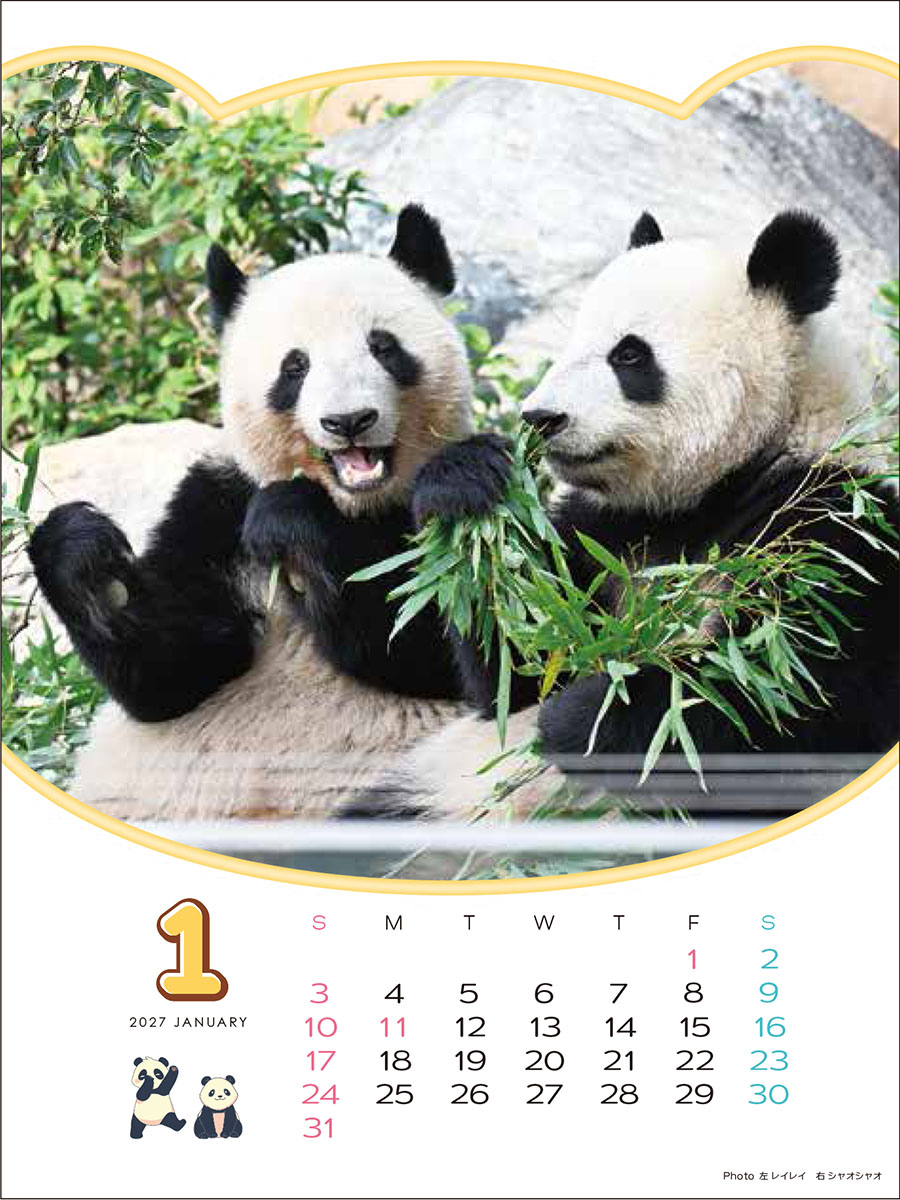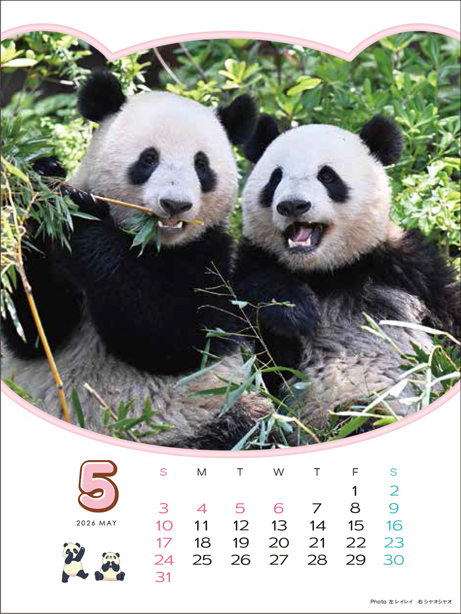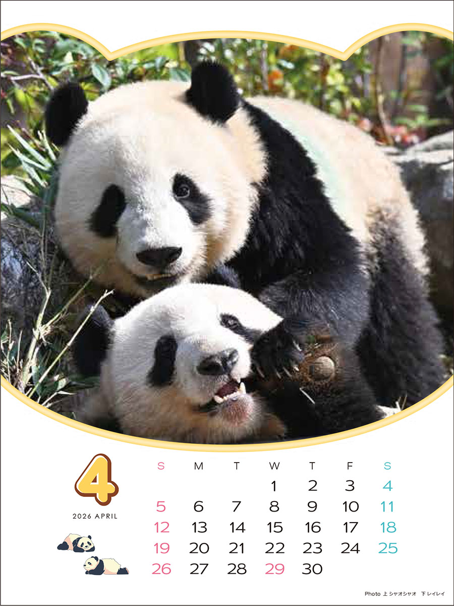 2021年6月23日に日本で誕生したシャオシャオとレイレイ。中国へと旅立つ「シャオシャオ・レイレイ」の思い出を詰め込んだ4月始まりカレンダーです。(掲載月:2026年4月~2027年4月) 大人気「シャンシャン」も掲載。撮影:高氏貴博 ※制作上の都合により、デザイン、写真等が変更になる場合があります。