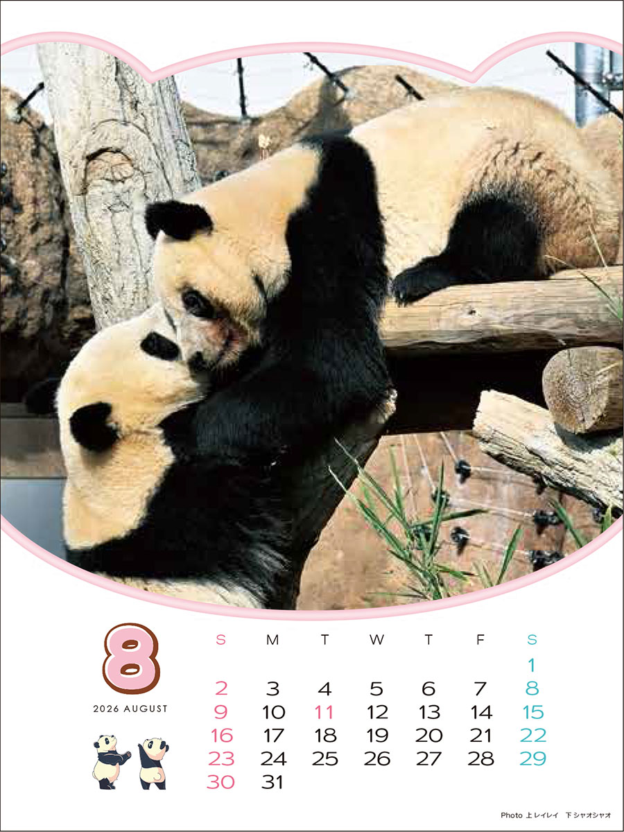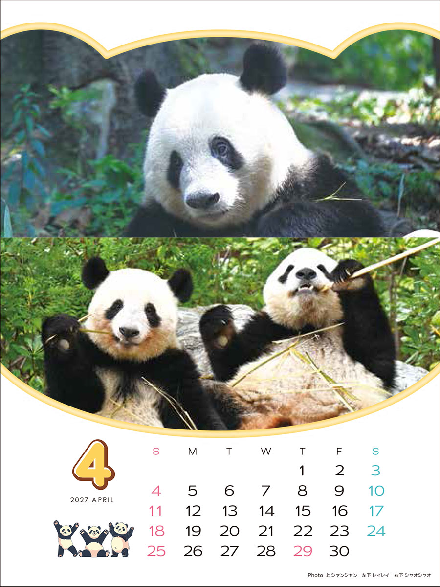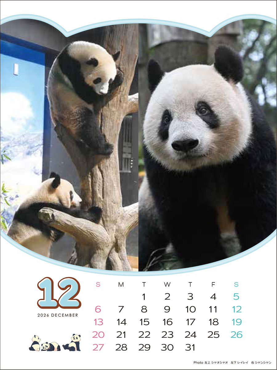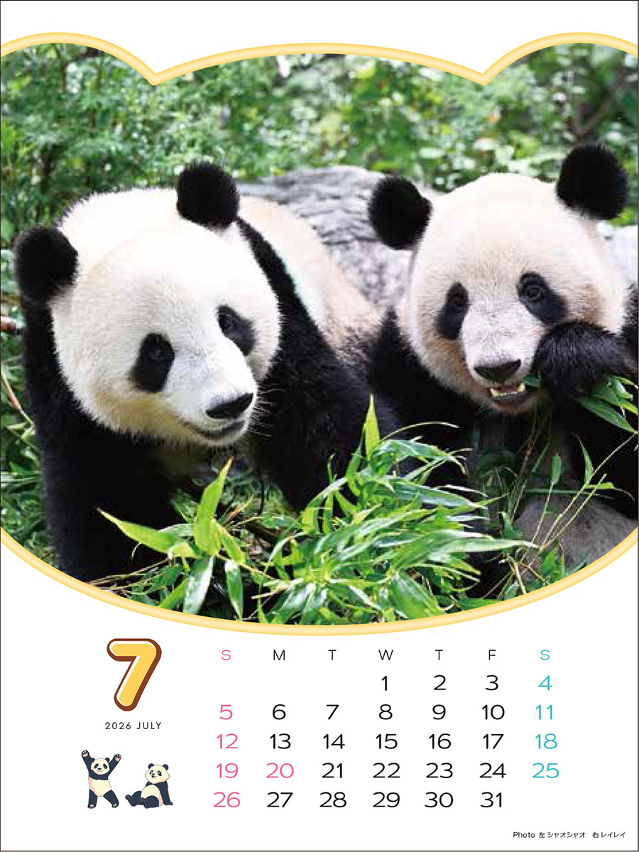 2021年6月23日に日本で誕生したシャオシャオとレイレイ。中国へと旅立つ「シャオシャオ・レイレイ」の思い出を詰め込んだ4月始まりカレンダーです。(掲載月:2026年4月~2027年4月) 大人気「シャンシャン」も掲載。撮影:高氏貴博 ※制作上の都合により、デザイン、写真等が変更になる場合があります。