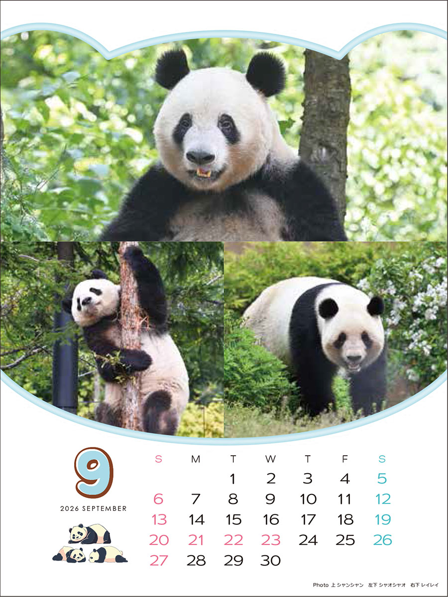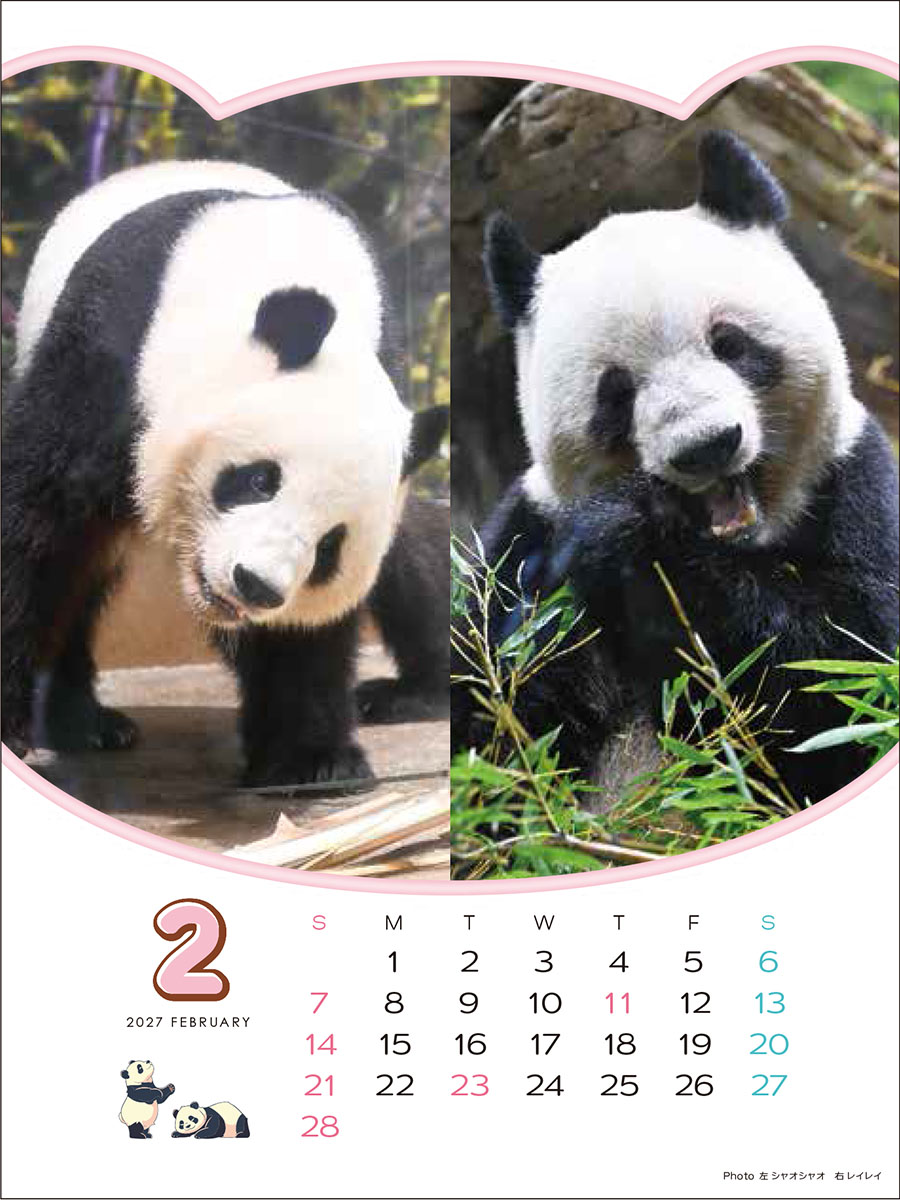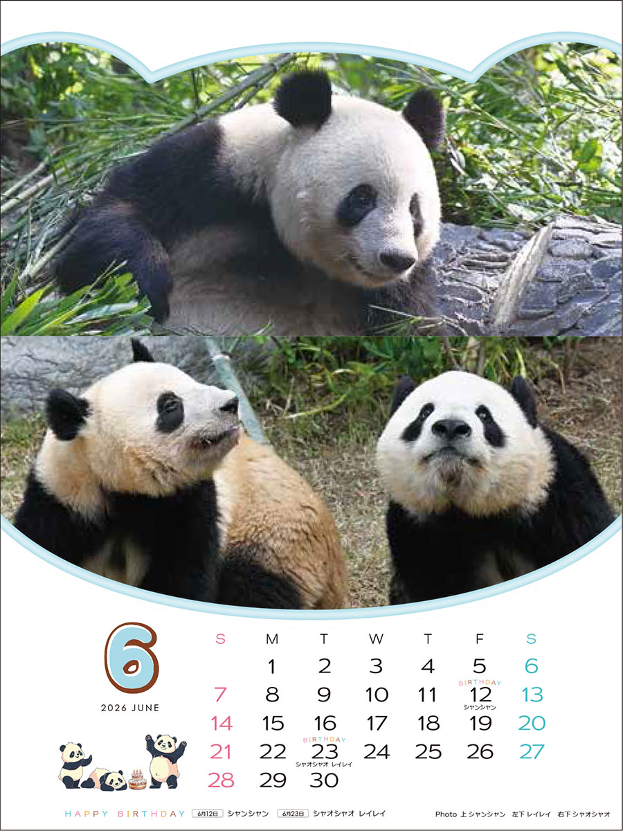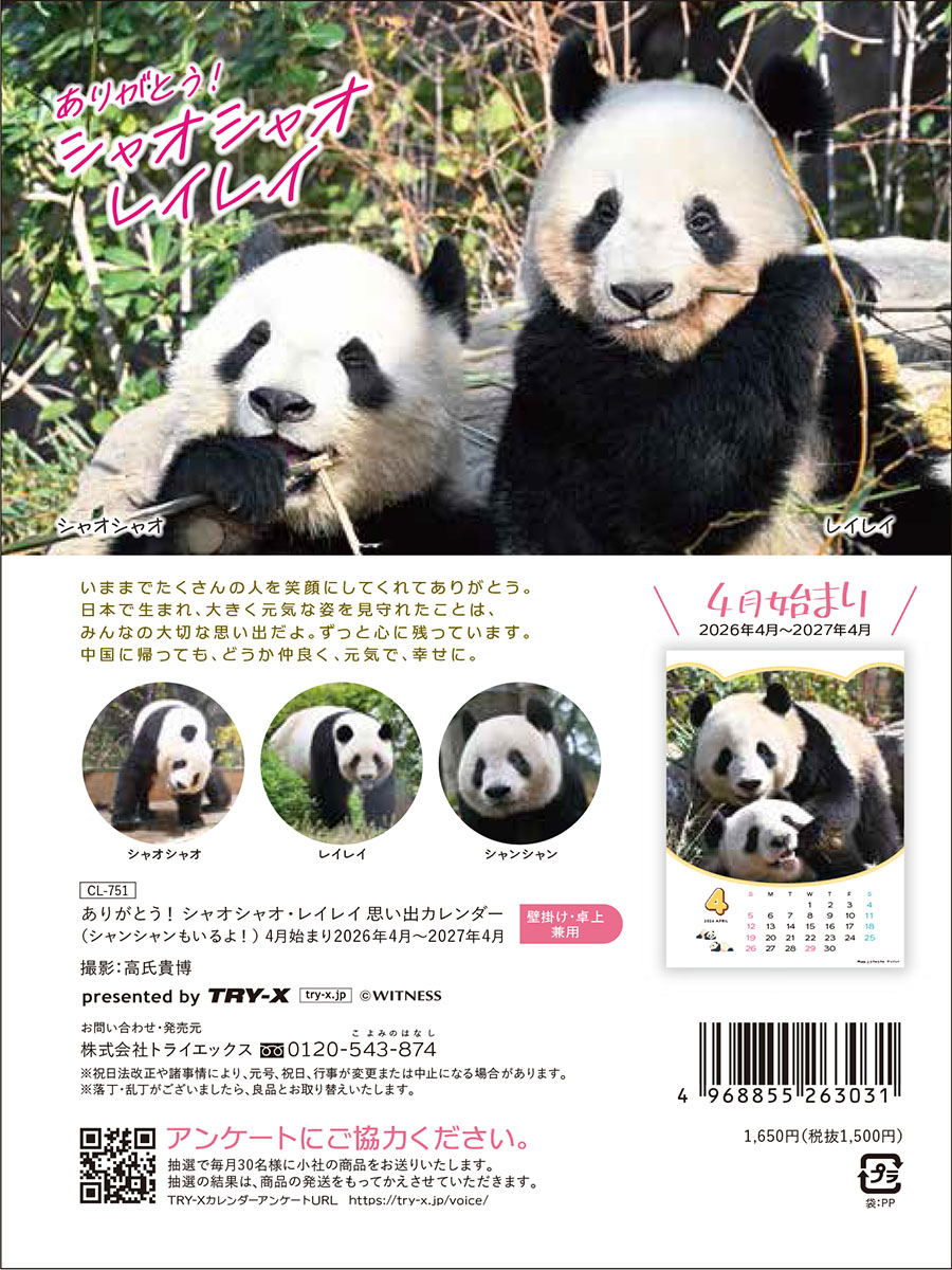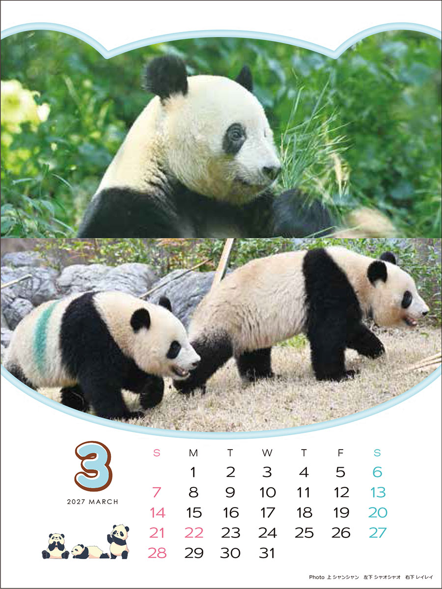 2021年6月23日に日本で誕生したシャオシャオとレイレイ。中国へと旅立つ「シャオシャオ・レイレイ」の思い出を詰め込んだ4月始まりカレンダーです。(掲載月:2026年4月~2027年4月) 大人気「シャンシャン」も掲載。撮影:高氏貴博 ※制作上の都合により、デザイン、写真等が変更になる場合があります。