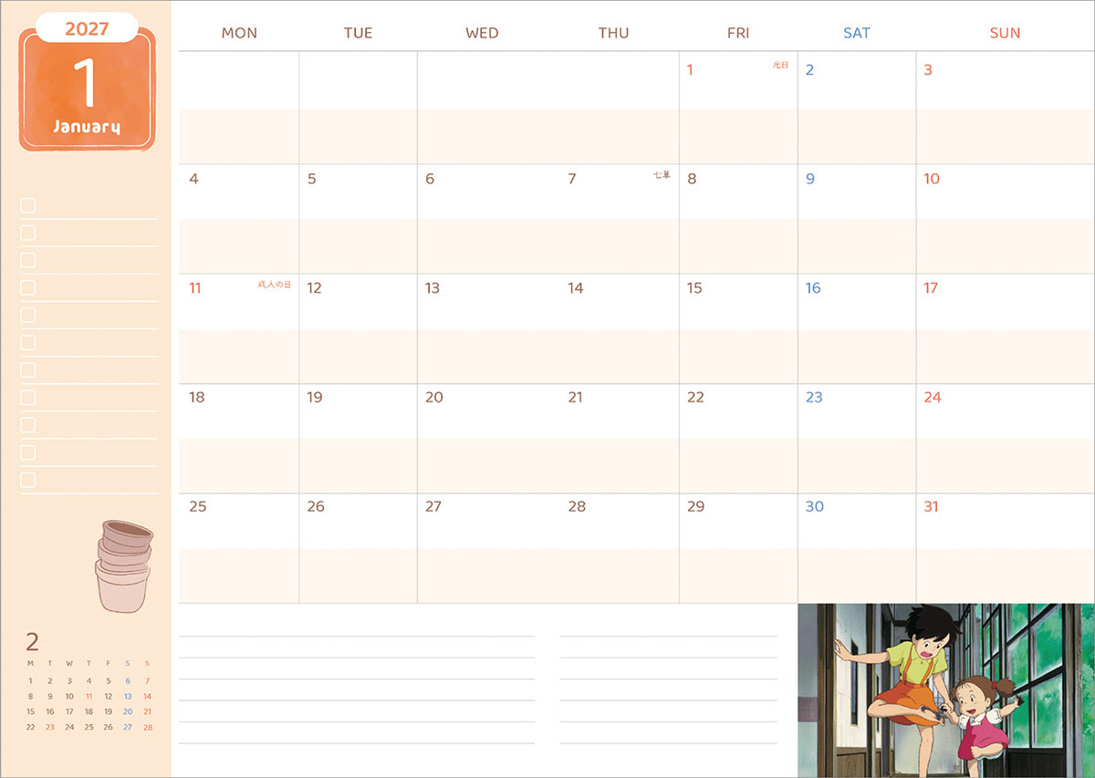 「となりのトトロ」2027年スケジュール帳が登場です。カバーは、金色の箔押しを施し豪華に仕上げています。本文は、「月間スケジュール/週間スケジュール/切り取りメモ」等シンプルで直感的に使いやすいページ構成になっています。2026年12月から2027年12月まで使用可能です。