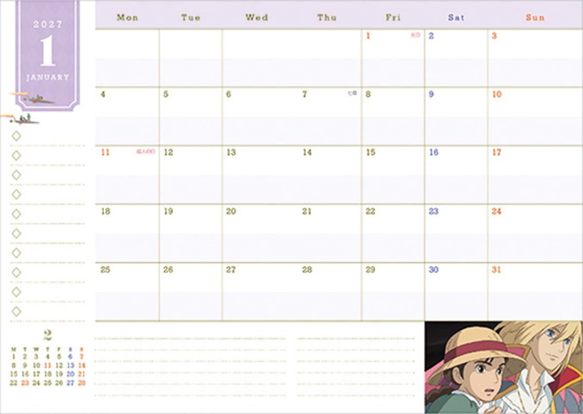 「ハウルの動く城」2027年スケジュール帳が登場です。カバーは、金色の箔押しを施し豪華に仕上げています。本文は、「月間スケジュール/週間スケジュール/切り取りメモ」等シンプルで直感的に使いやすいページ構成になっています。2026年12月から2027年12月まで使用可能です。